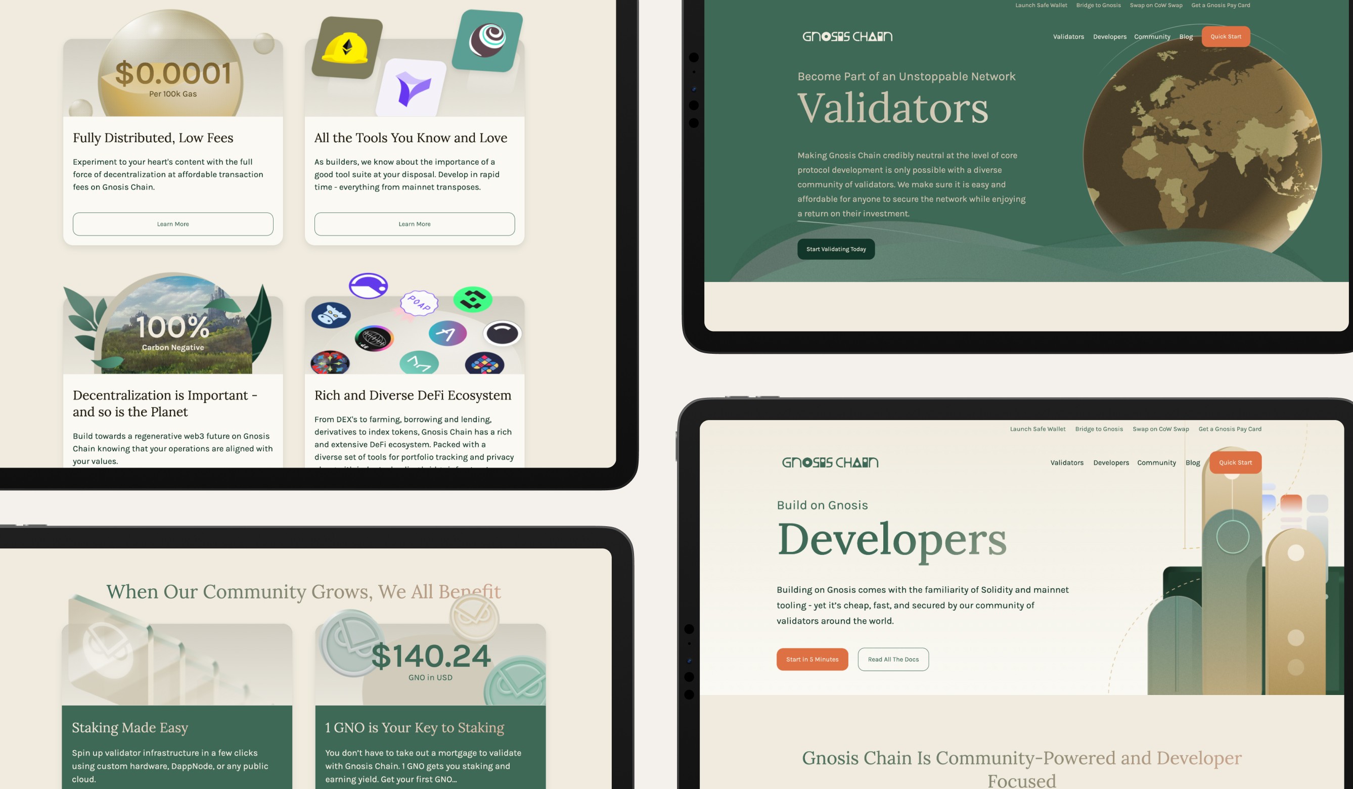 As a Designer at Gnosis, I played a key role in revamping the branding system, website, and various ecosystem products related to Gnosis Chain. The rebranding was inspired by the Solarpunk aesthetic, influencing the iconography, typography, color palette, and visual assets to align with a forward-thinking, decentralized future. My work focused on creating a cohesive and visually compelling identity that resonated with the Gnosis community and its values.