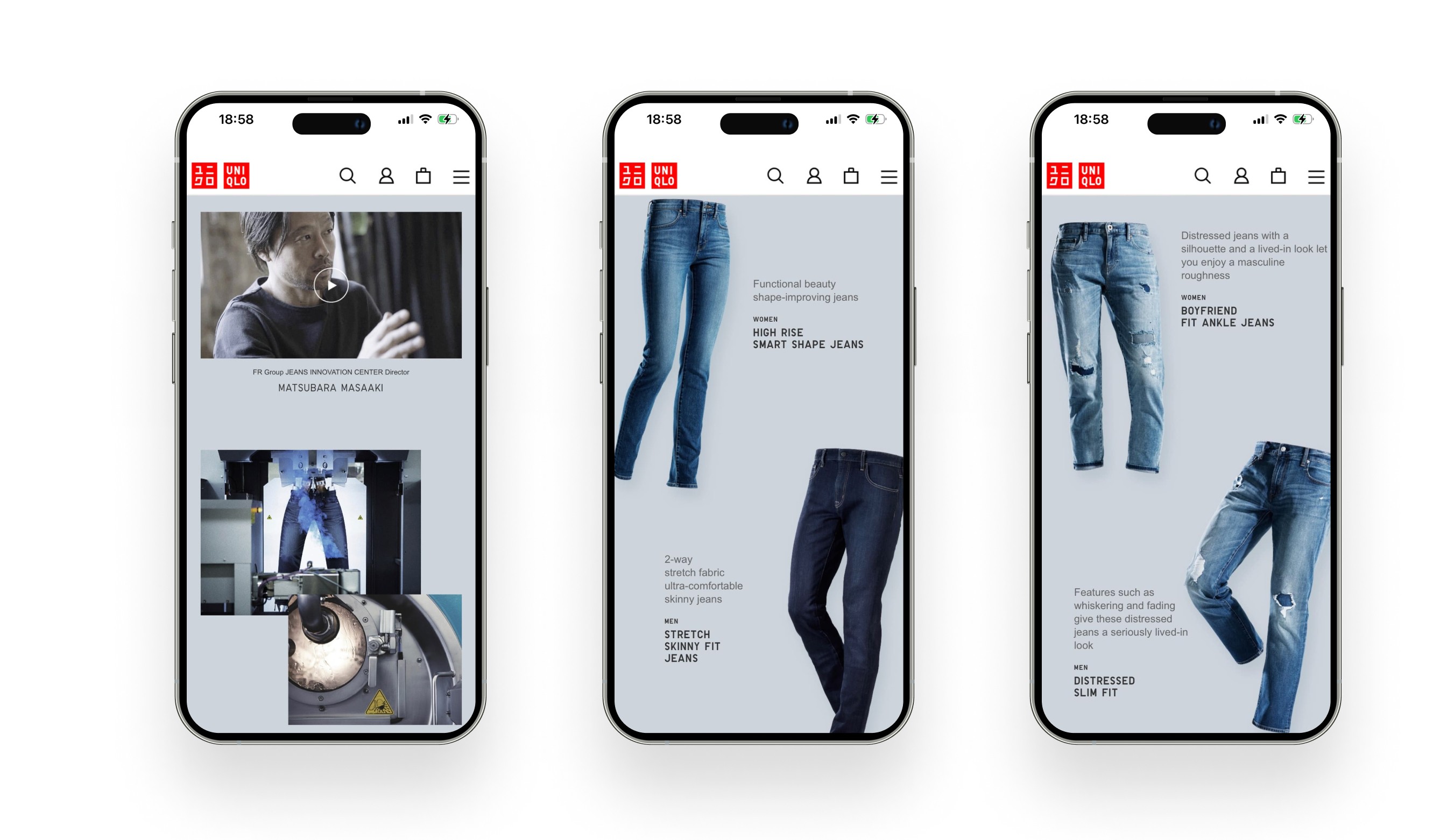 The aim of this 2 part content page is to tell the story of Uniqlo's Jeans and the various processes involved in creating a pair.